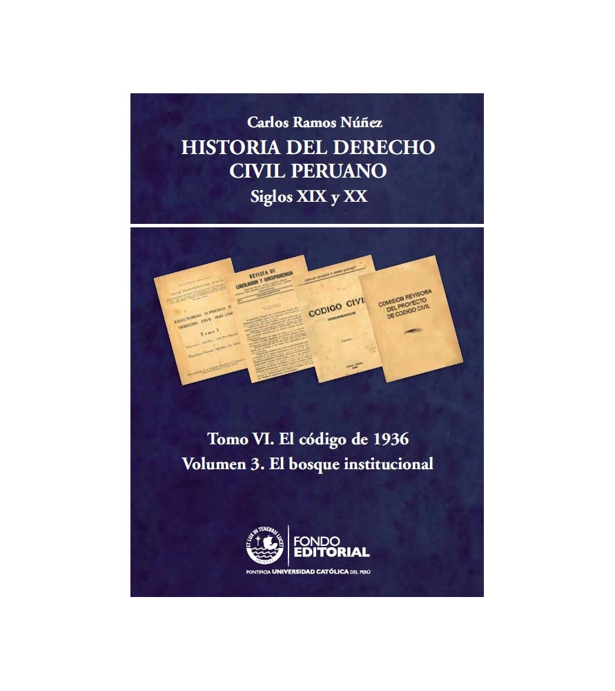 De todos los volúmenes de nuestra Historia del Derecho Civil peruano hasta ahora publicados, el presente puede considerarse por su temática como el más propiamente «jurídico». Con ello, sin embargo, no pretendemos desanimar a los eventuales lectores de este libro que, más interesados en sus aspectos históricos, desconozcan la jerga forense, por lo que en la redacción del presente texto se ha procurado simplificar el lenguaje técnico hasta donde ha sido posible. Con todo, el propósito del trabajo de Carlos Ramos Núñez es inequívoco: el análisis y valoración de los debates que antecedieron al establecimiento del código civil de 1936, de modo que la principal fuente histórico-jurídica directa e inmediata serán las actas de las sesiones, así como las consultas emitidas que condujeron a la promulgación del que es considerado por gran parte de los entendidos como el código civil más importante de la historia del Perú.